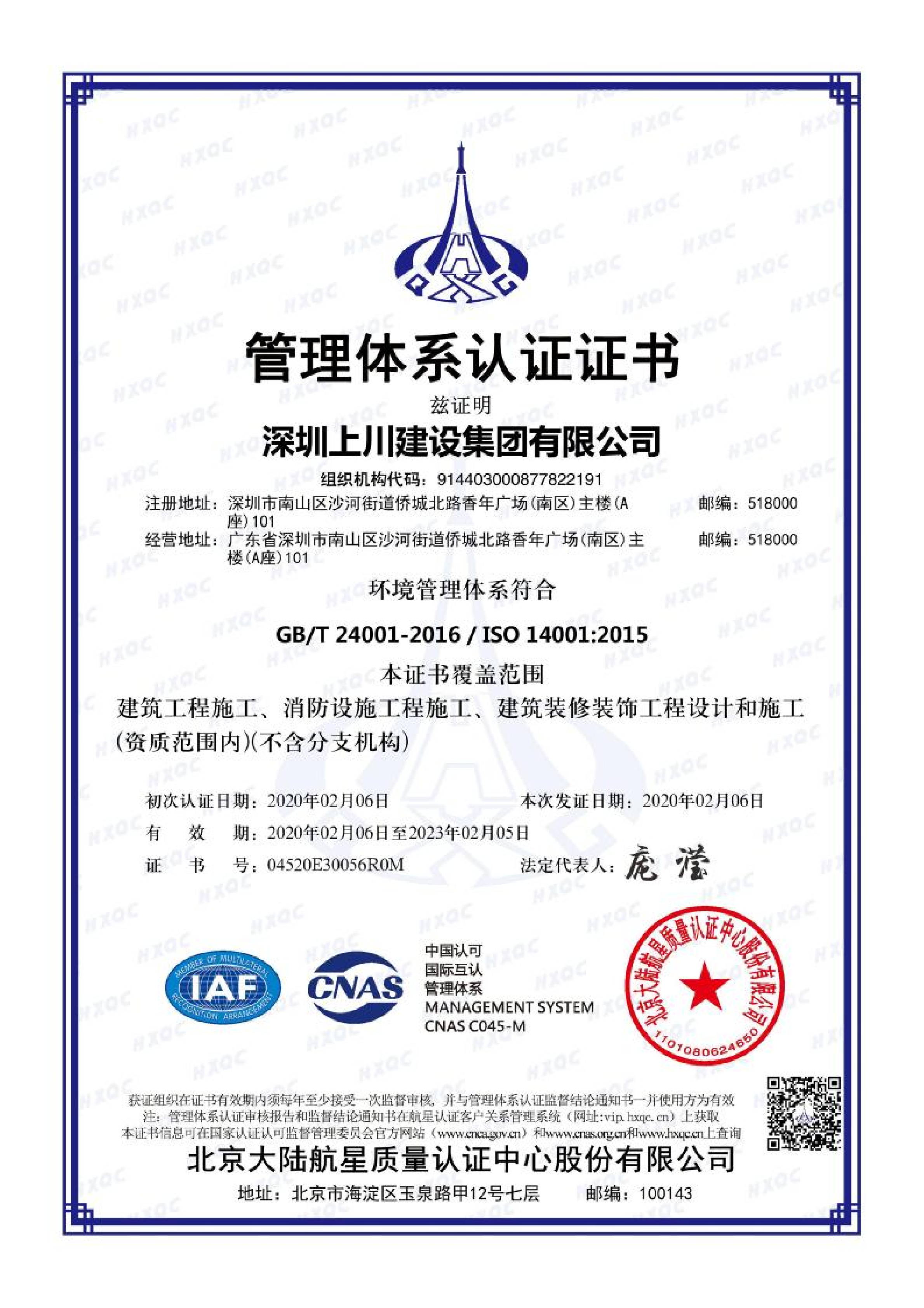 上川建設-環境管理體系認證證書