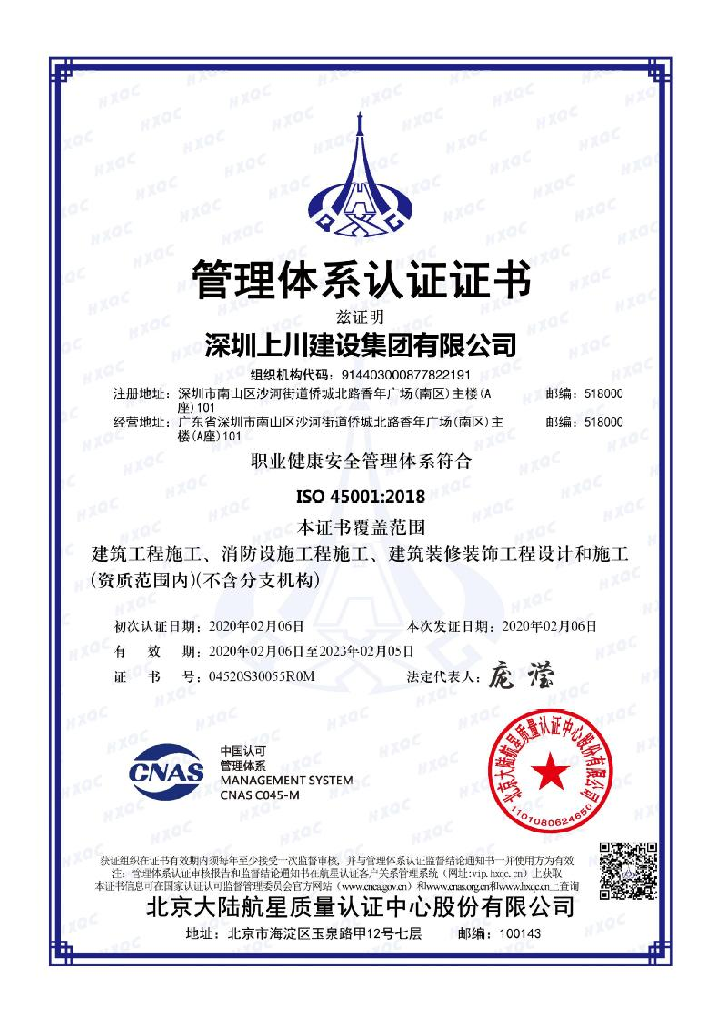 上川建設-職業健康安全管理體系認證證書